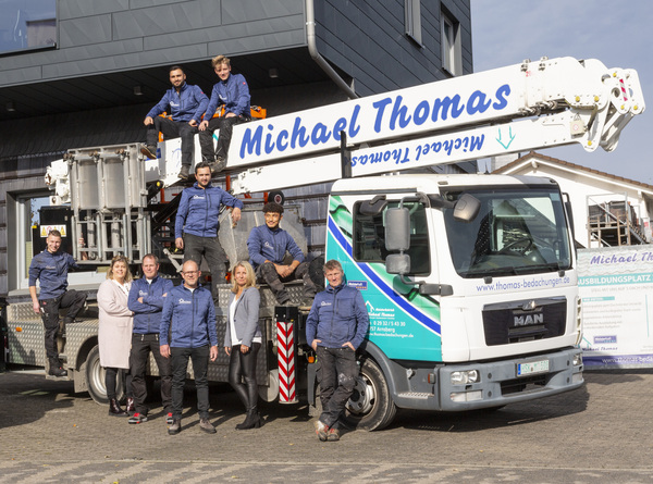 Geschäftsführer Michael Thomas, Dachdeckermeister und Gebäudeenergieberater (HWK), beschäftigt zurzeit einen Meister, sechs Gesellen, zwei Helfer, einen Azubi und eine Sekretärin.